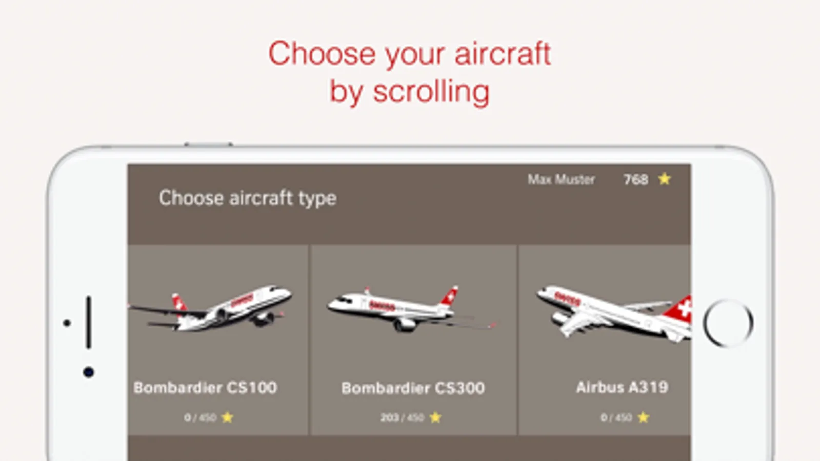 The SWISS flight simulation app guarantees maximum gameplay: have a seat in the cockpit of our flagship plane, the Boeing 777-300ER, or act as captain of the brand new Bombardier C Series. Thanks to the replay function, you can easily play back your landing from various different perspectives. Experience Zurich Airport and its surroundings in a remarkably realistic way. Choose from three difficulty levels and compete with friends. With just a click, you can readily share your point scores on social media and determine who is King of the air. Earn points after every successful landing and unlock exciting additional features.