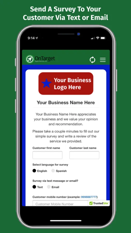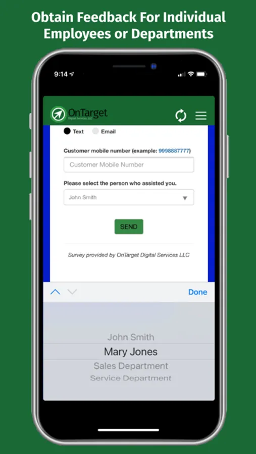 OnTarget’s Send A Survey app provides businesses a simple way to engage with their customers via a text or email survey to request valuable feedback that helps build a positive online reputation and improve business practices. The online reviews received for the business will promote the business by way of direct customer referrals showing up on the major review sites that appear in organic search results.