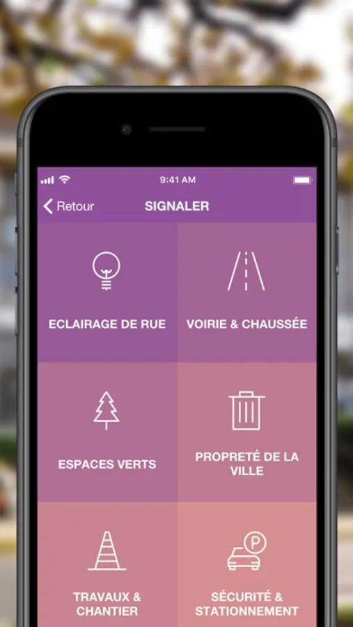 • Signalez instantanément les incidents que vous pouvez rencontrer : chaussée endommagée, éclairage public défaillant, etc.