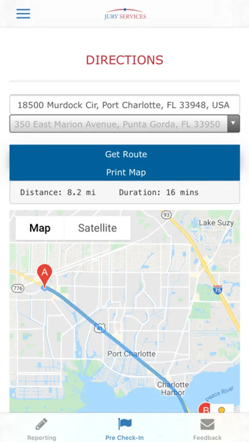 Location Services - We offer an interface into google maps which provides directions to the Charlotte County Justice Center with the ability print if you choose.