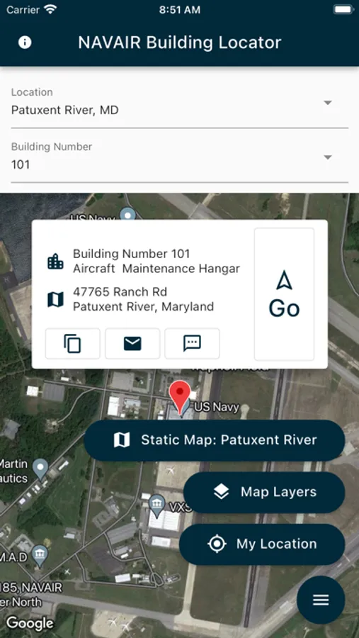 NAVAIR Building Locator is the go to mobile application in order to find where you need to go on any NAVAIR base. This application allows you to search any building number and gives you the ability to immediately navigate using Apple Maps, or email/text directions to a friend.