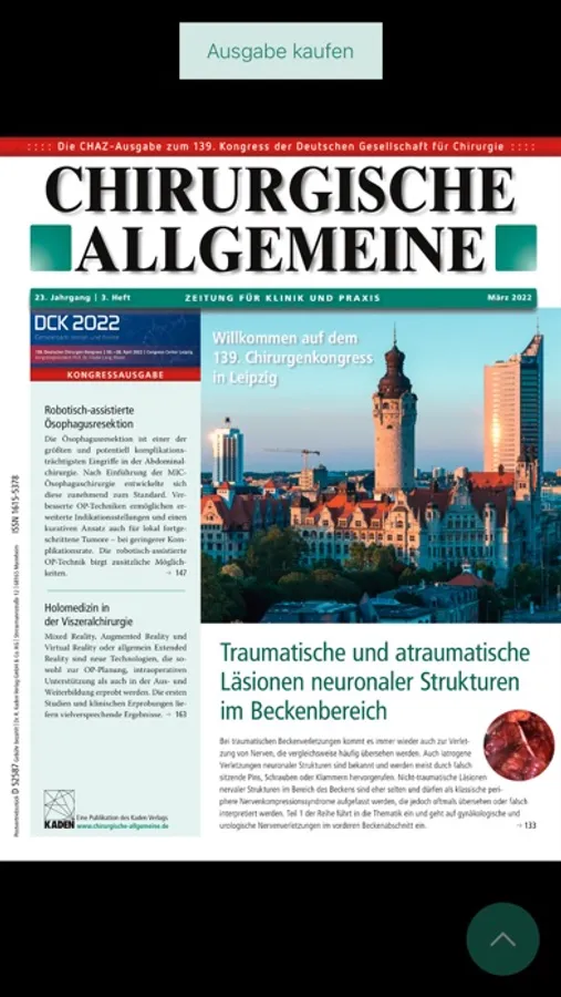 Die CHIRURGISCHE ALLGEMEINE informiert Chirurgen aller Fachrichtungen aktuell und zuverlässig. Nachrichten und Berichte informieren über Kongresse, Berufspolitik, Abrechnungsfragen, Klinik- und Praxismanagement sowie neue Entwicklungen aus Technik und Pharmazie. Die Abonnenten profitieren zudem vom CME-Fortbildungsprogramm. Der Chirurg erhält so einen fundierten Überblick über die aktuellen Entwicklungen und Fortschritte im Fachgebiet in knapper, gut verständlicher Form. Die CHIRURGISCHE ALLGEMEINE erscheint zehnmal im Jahr.