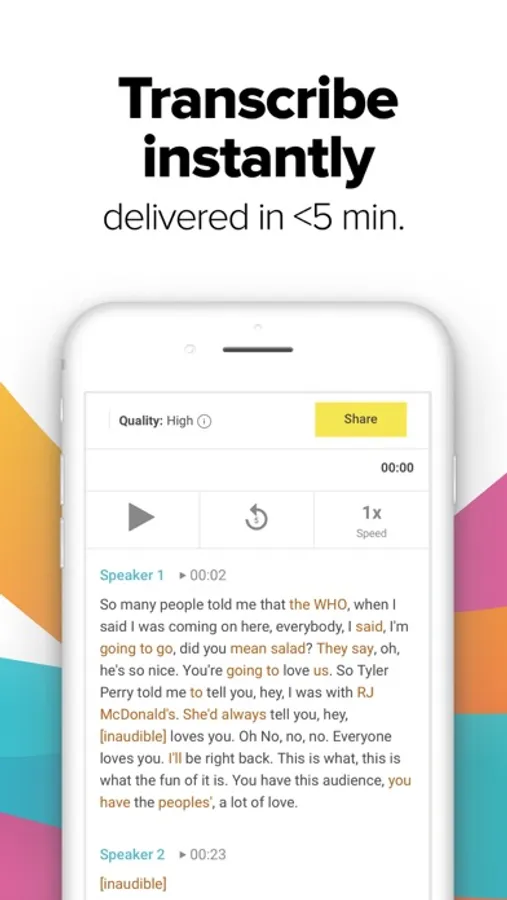 √ Second pass transcript includes higher accuracy, speaker labels, and download/share capability