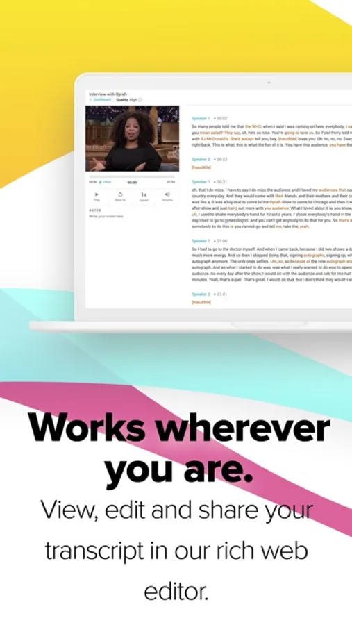 Temi is built with the world's most accurate speech recognition engine. Get real-time live streaming of voice-to-text as you record! Store, search and capture insights from transcripts synced to your audio (low per minute charge for transcripts).