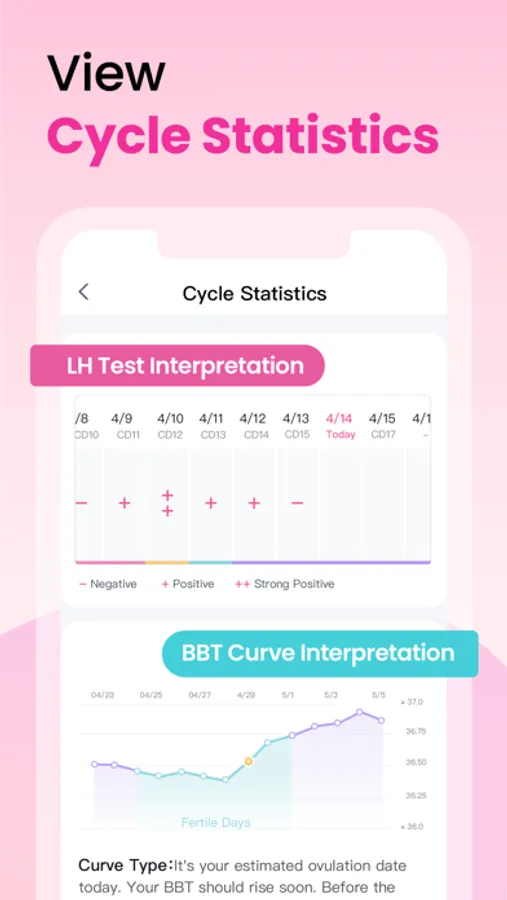 - Current & Previous Menstrual Cycle Interpretation: Analysis of BBT curves, ovulation test, pregnancy test, PMS and ovulation symptoms. Track ovulation and reveal the conception rate to manage ovulation and fertility with precision