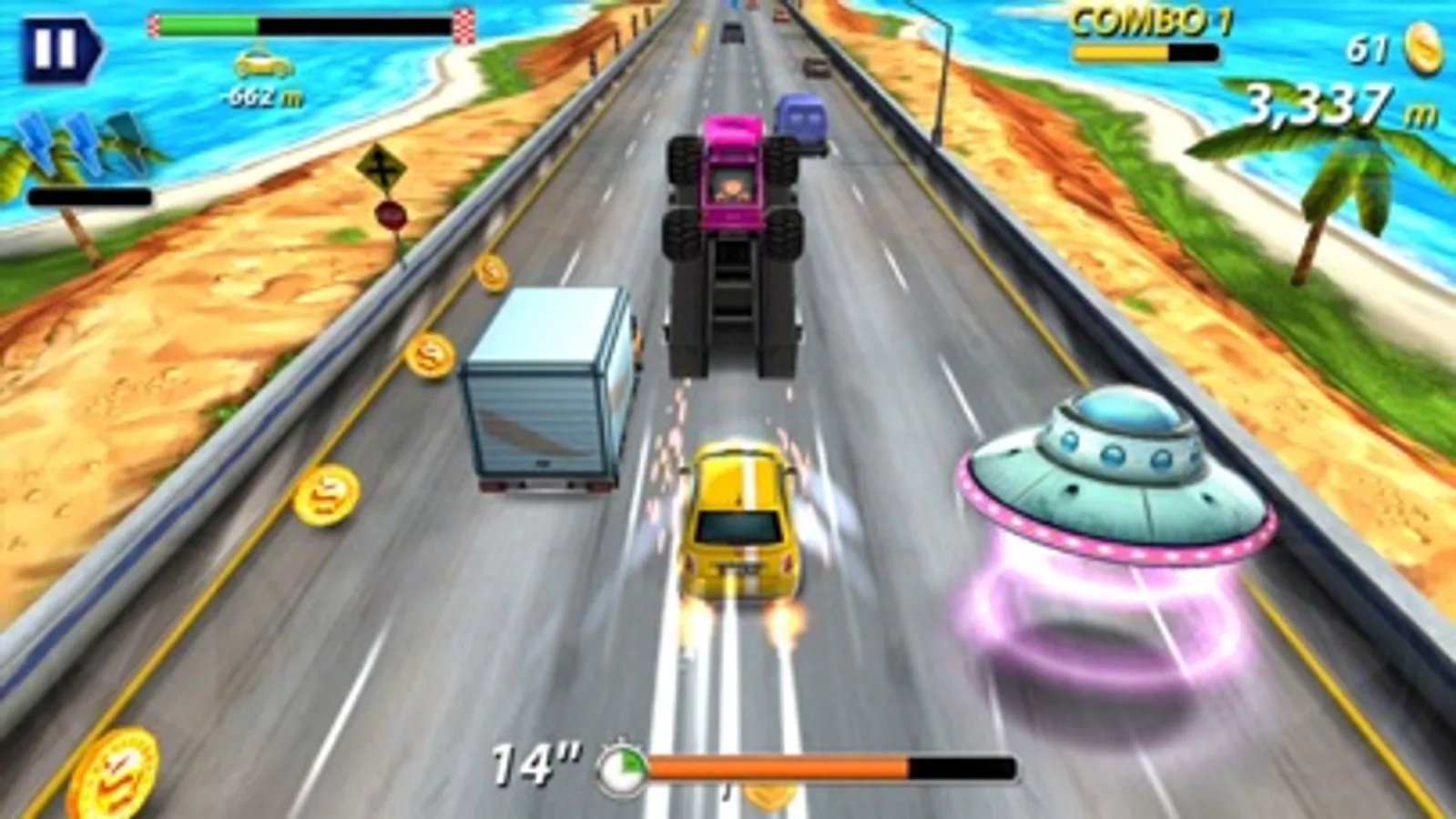 在高速公路模式下,你可以收集越来越多的硬币。但是要小心道路上的交通和石油!