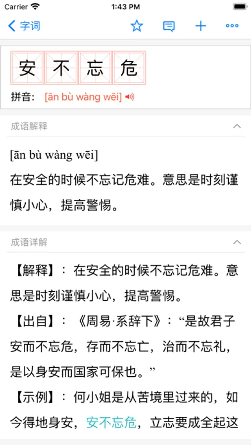 词库提供海量的内容,并提供了每个成语的注解、来源、例句。