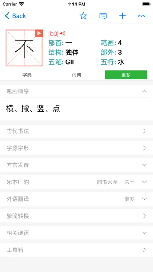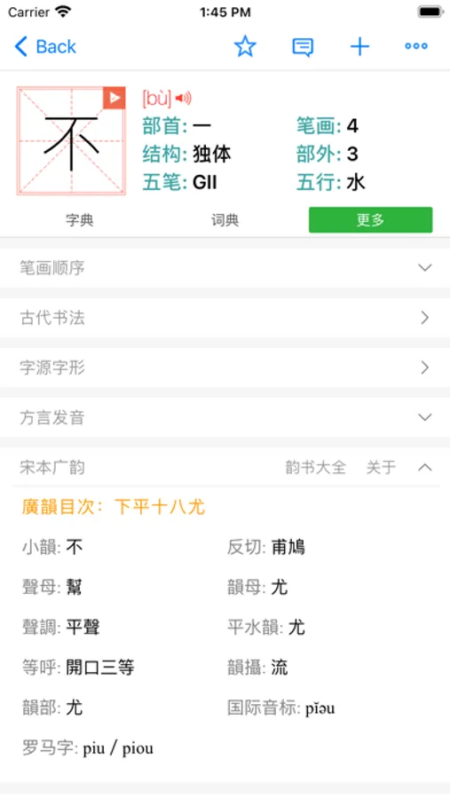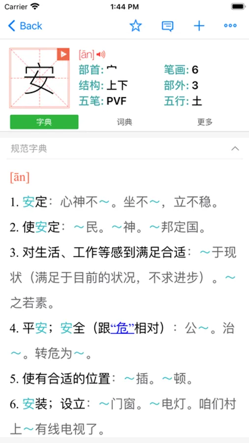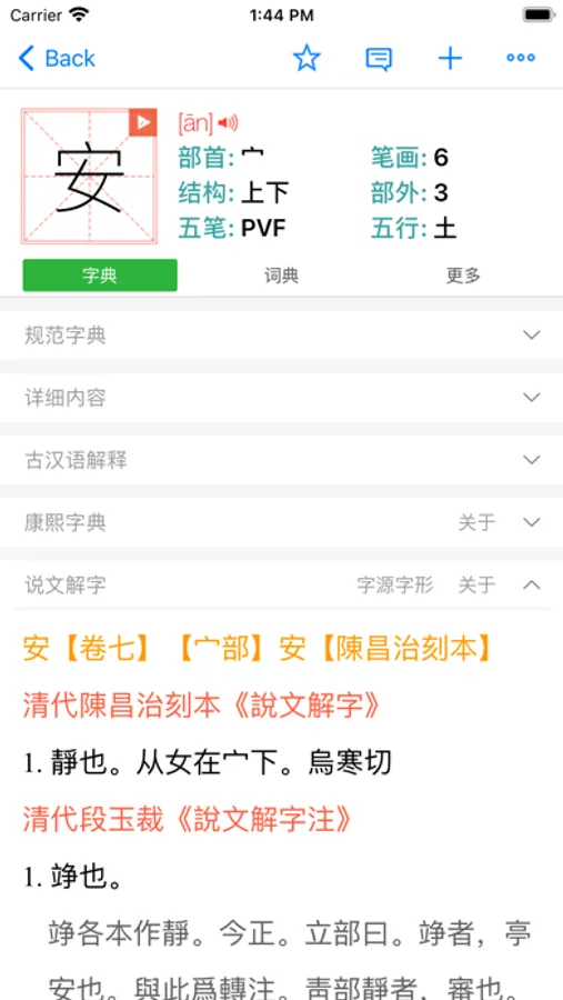 8、每个字包含了详细的字的解释和用法,以及字的拼音、笔划、部首、五笔、五笔字根等信息。