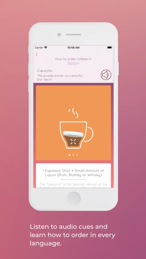 - Learn how to order your coffee like a local, with audio cues and pre-made sentences.