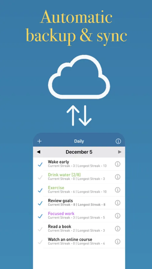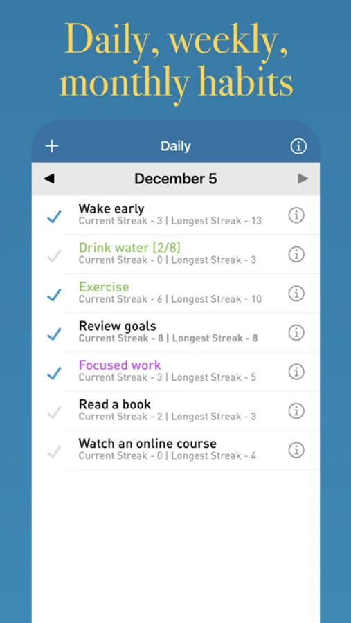 You can track not just daily, but also weekly and monthly habits. Each type has its own tab for your convenience.