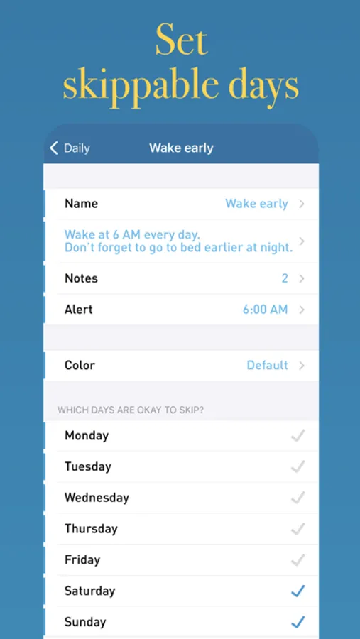 Your streak will continue through these days. So if you choose not to do the habit on the weekend, for example, you won’t break your streak.