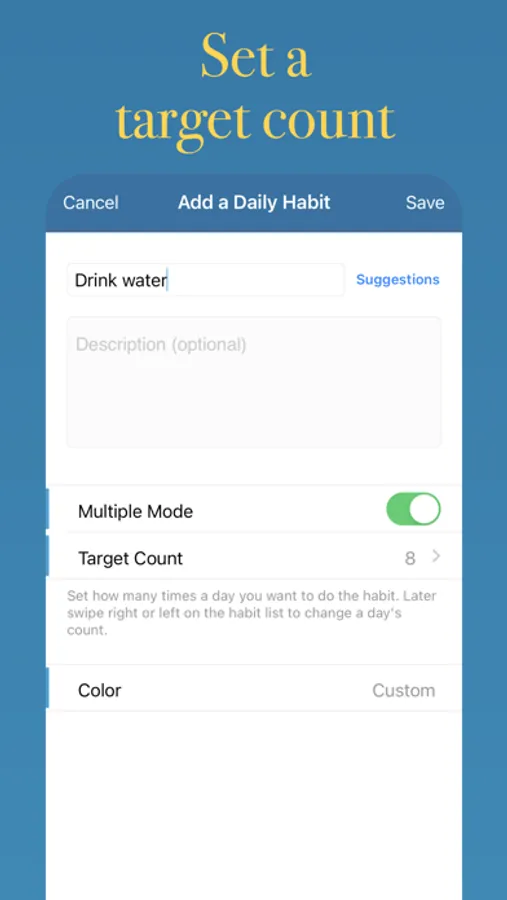 If you want to do a habit multiple times per time period, you can do that. Just turn on Multiple Mode when adding a new habit. Then swipe right or left to reveal the + and - button to change the count.
