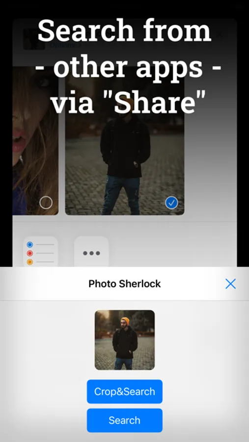App provides search by image taken from camera or from gallery. Can be used to find information about photo on Internet, for example to detect real owner of photo from social network (check if photo is fake). Contains crop functionality.