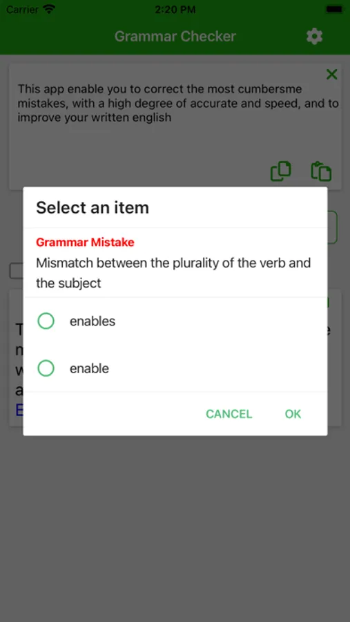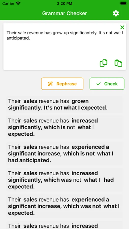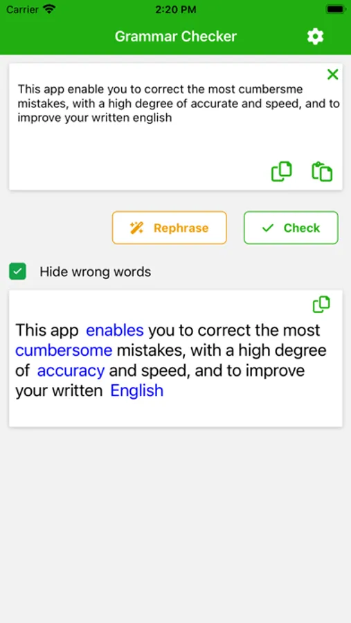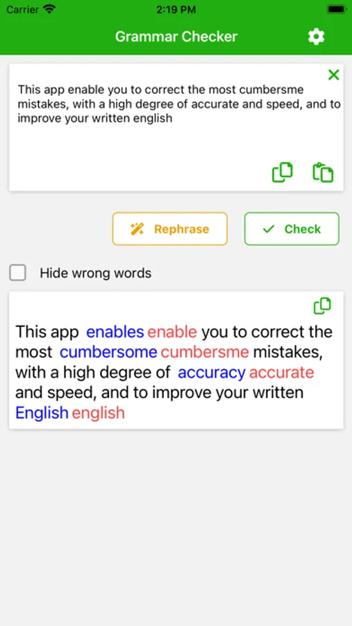 Detects and corrects all types of grammar and spelling mistakes: wrong verb tenses, lack of agreement between subject and verb, incorrect prepositions, confusion between words with similar spelling, typos and punctuation errors.