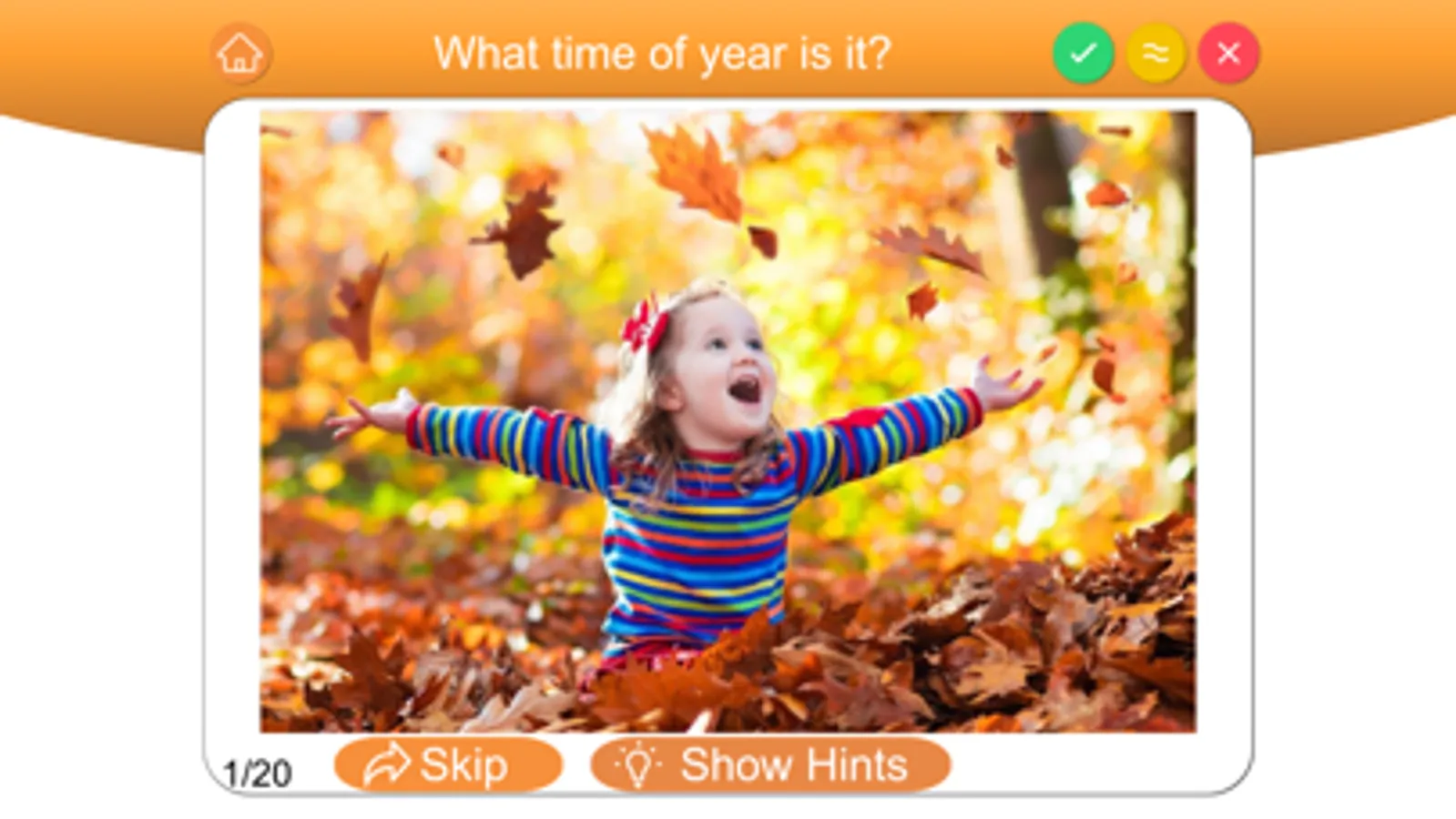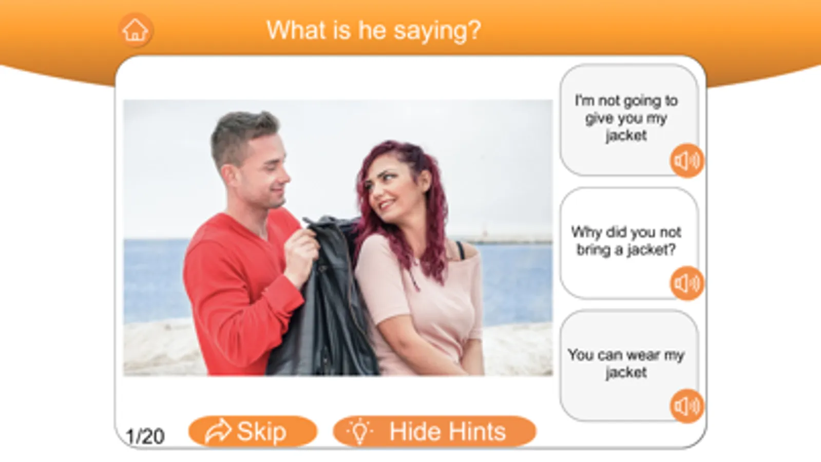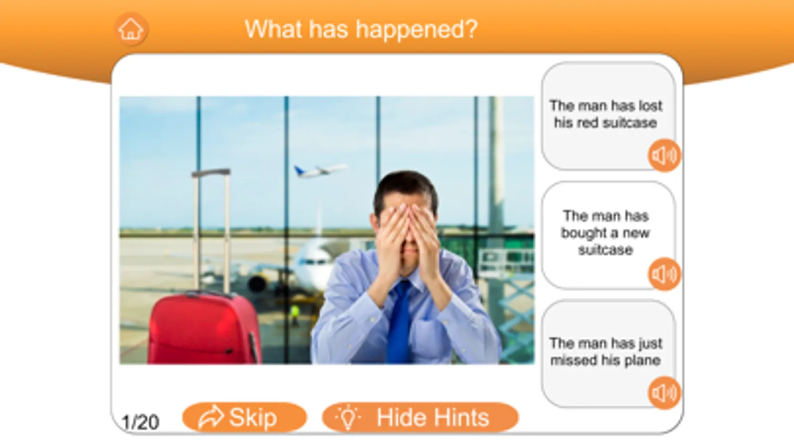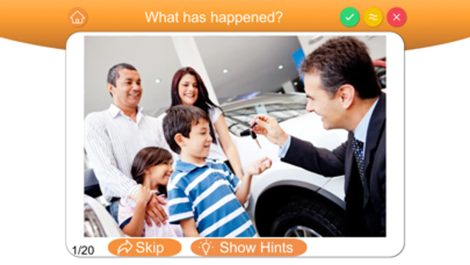 ASK THE FIRST QUESTION. The first question will vary depending on the chosen activity. It asks the user to make a social inference e.g. What has happened? How are they feeling? etc. For example, in the Conversations activity, the first question is always “What are they saying?” Help the child or adult user to form well-shaped answers.