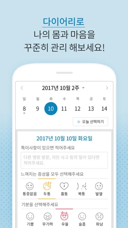 나의 증상, 기분, 특이사항을 기록해 몸과 마음을 꾸준히 관리할 수 있습니다.