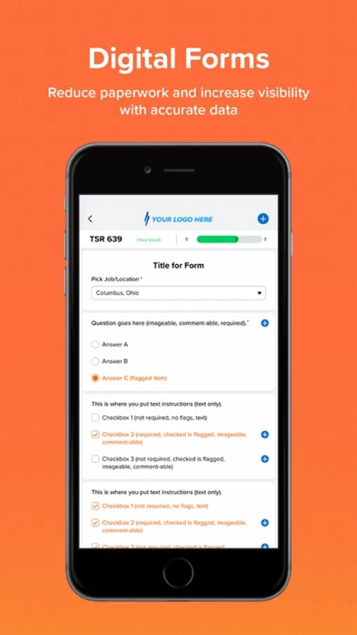 • Custom forms for reports, surveys, inspections, checklists, etc.