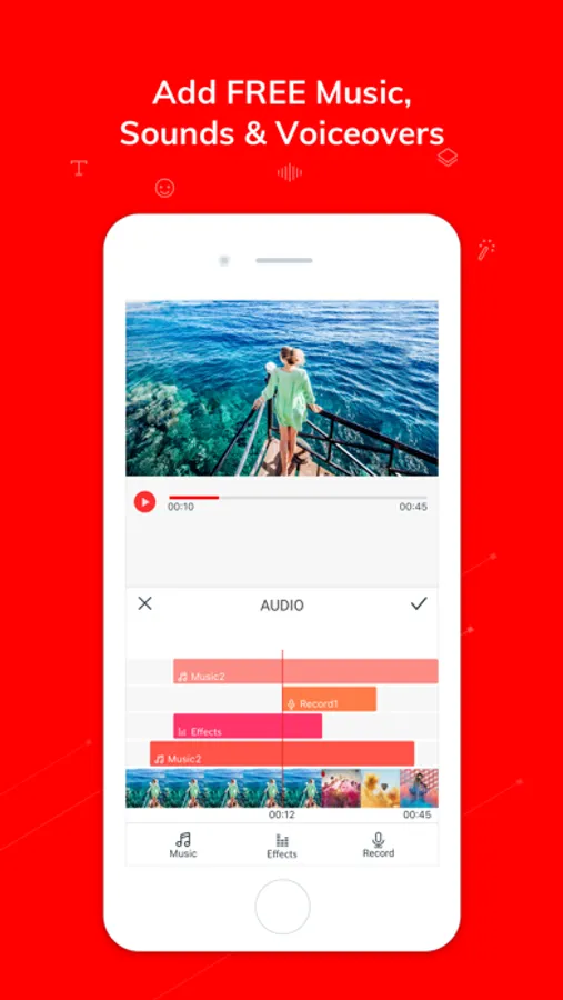 • Create a soundtrack using Vlogit’s built-in music library and songs from your device