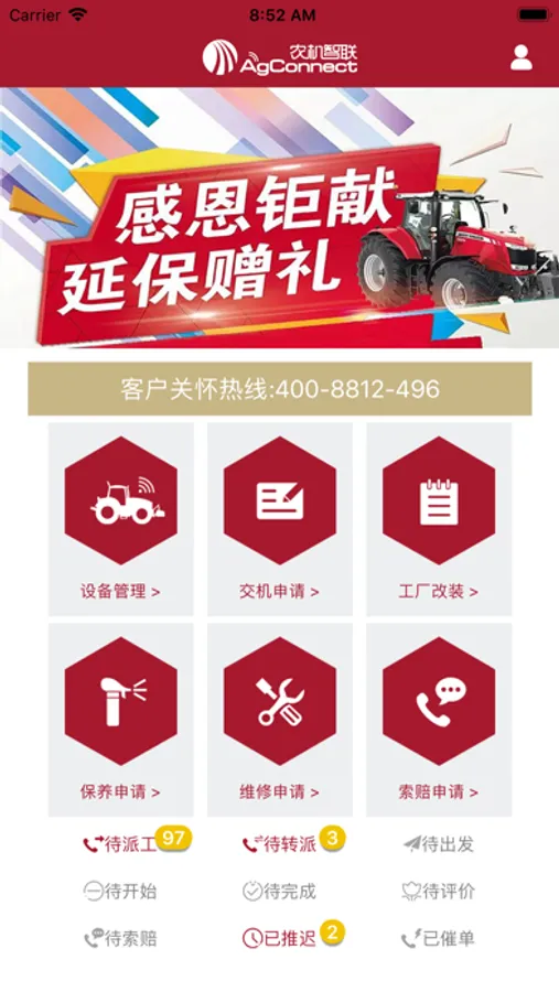 AgConnect农机智联将采集爱科旗下品牌各类型各系列农机的地理位置信息以及智能化农机的作业状态、工作性能等百项参数,实现实时机器管理、地理位置服务、报警提醒和报告分析等功能。农机大数据分析将机器采集到的诸多实时数据与内部和第三方数据相结合,形成爱科农机大数据分析平台,从而优化产品及提升产品性能,改善服务备件的响应能力,进一步指导农户改善农业生产经营,统筹优化农业生产资料,为客户提供更优更好的支持服务。