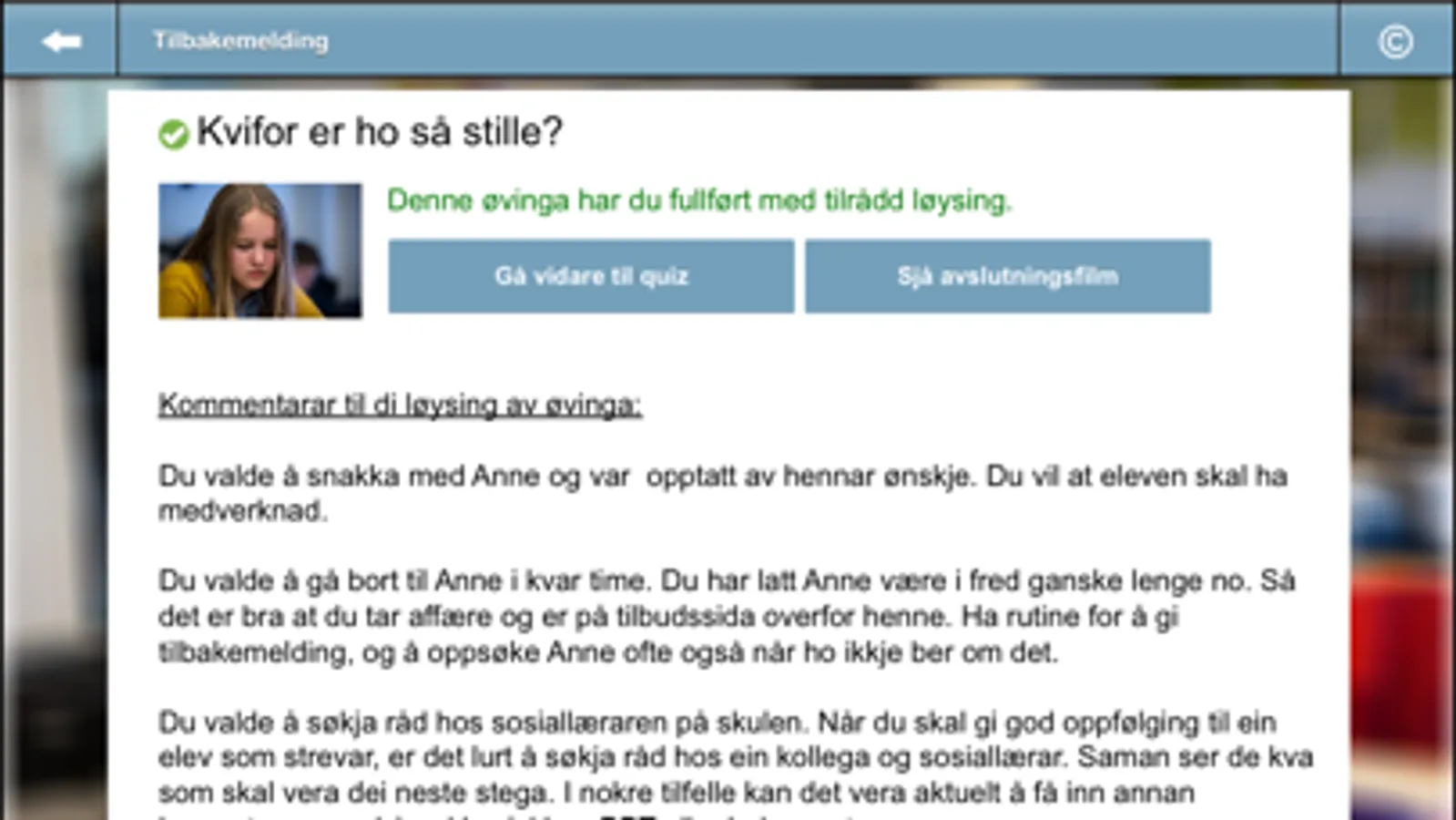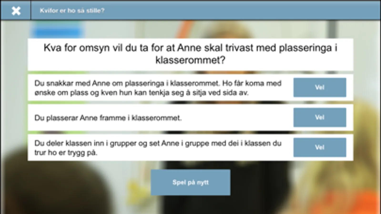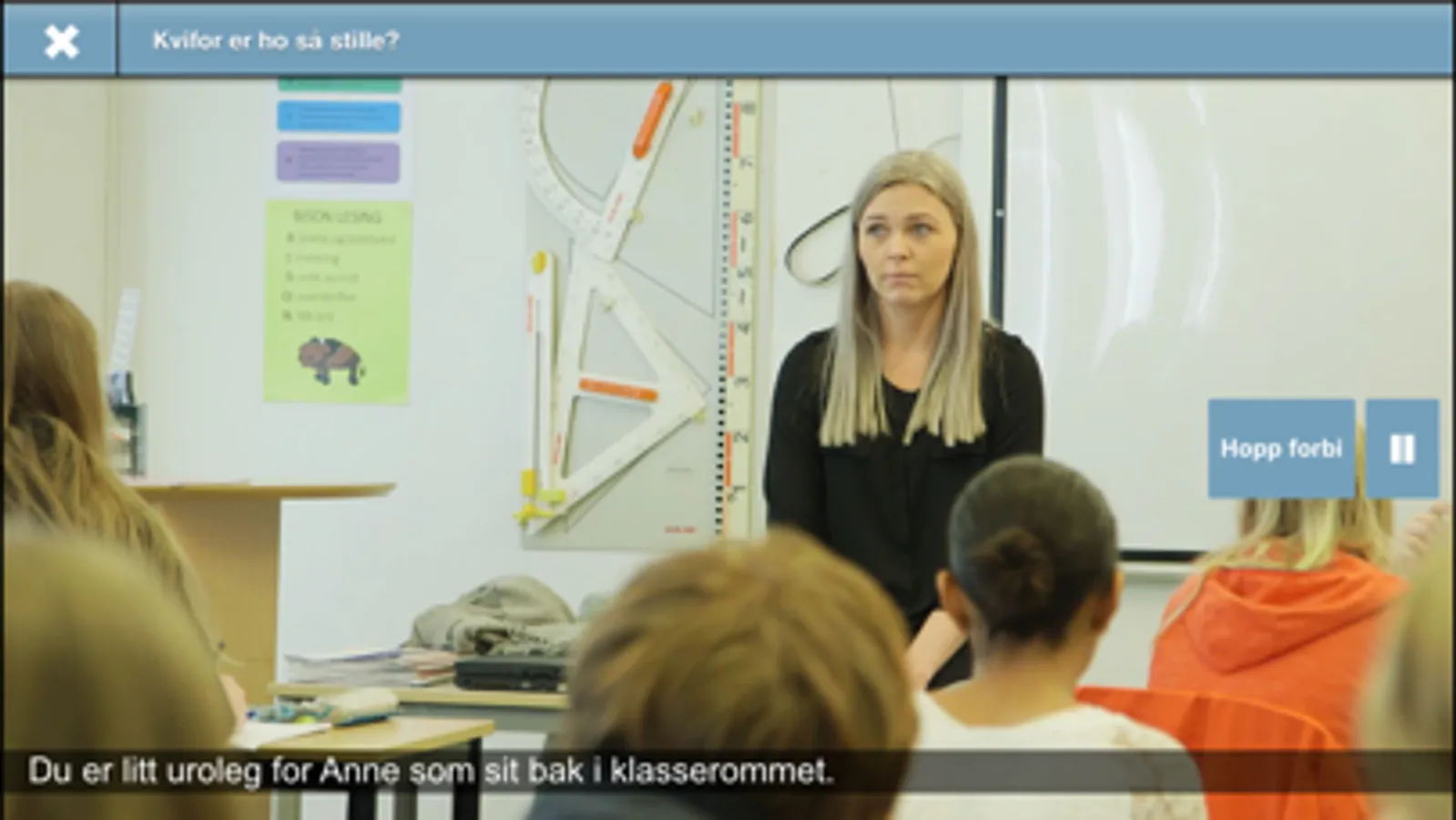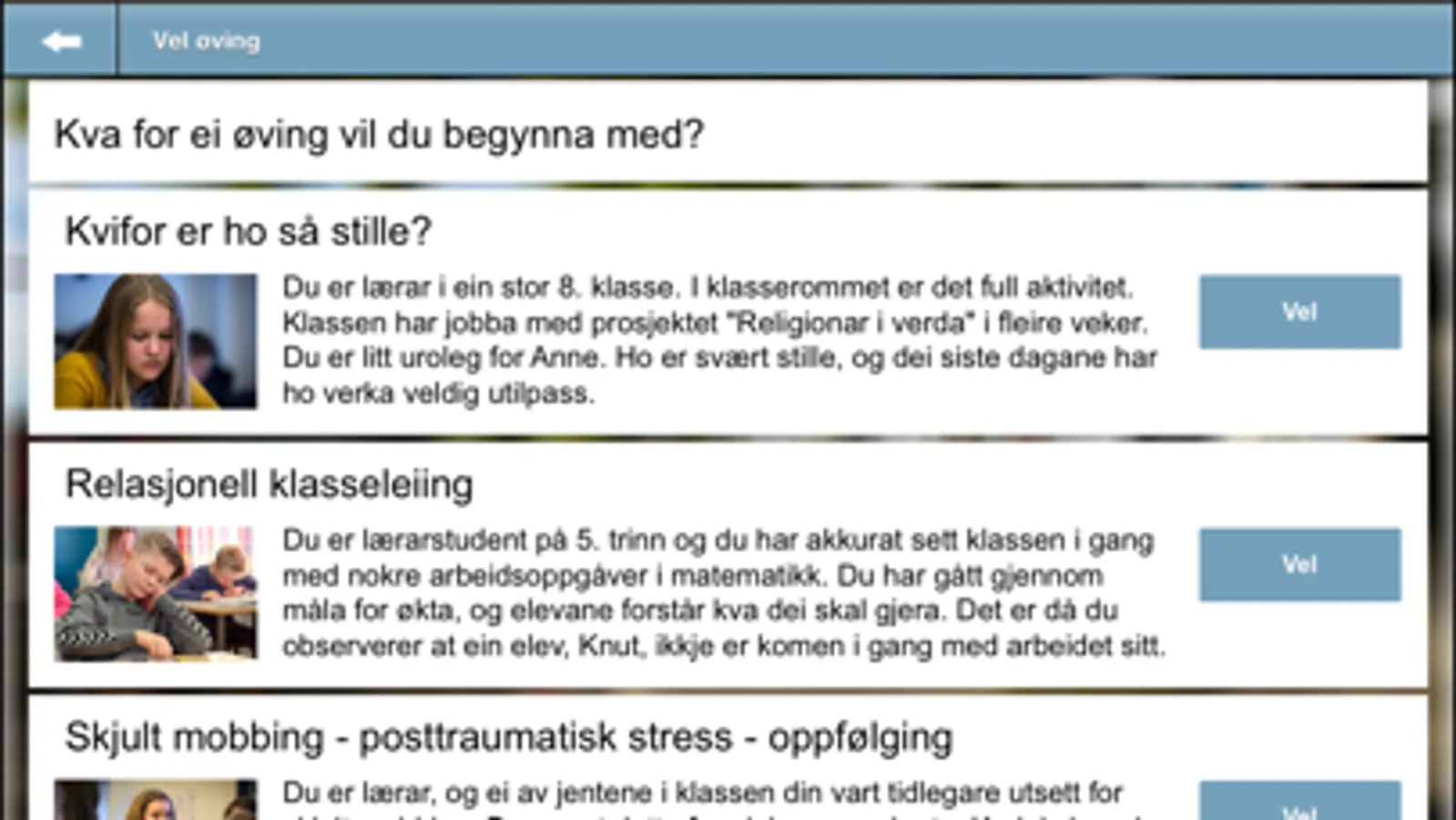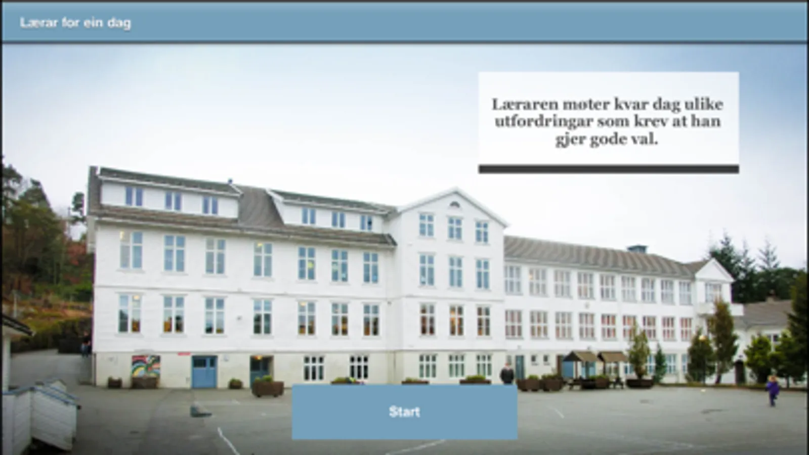 Korleis er det å vera lærar for ein dag? I denne appen får du delta i nokre episodar som kan dukka opp i klasserommet. Dette er utfordringar som krev at du som lærar gjer gode val. – I episodane her kan du øva, testa og reflektera over handlingar og val. Du kan gjera det åleine eller i lag med andre. Appen er utvikla av Høgskulen på Vestlandet og Universitetet i Stavanger, og retta mot grunnskulelærarutdanninga. Utviklinga er gjort med støtte frå Norgesuniversitetet.