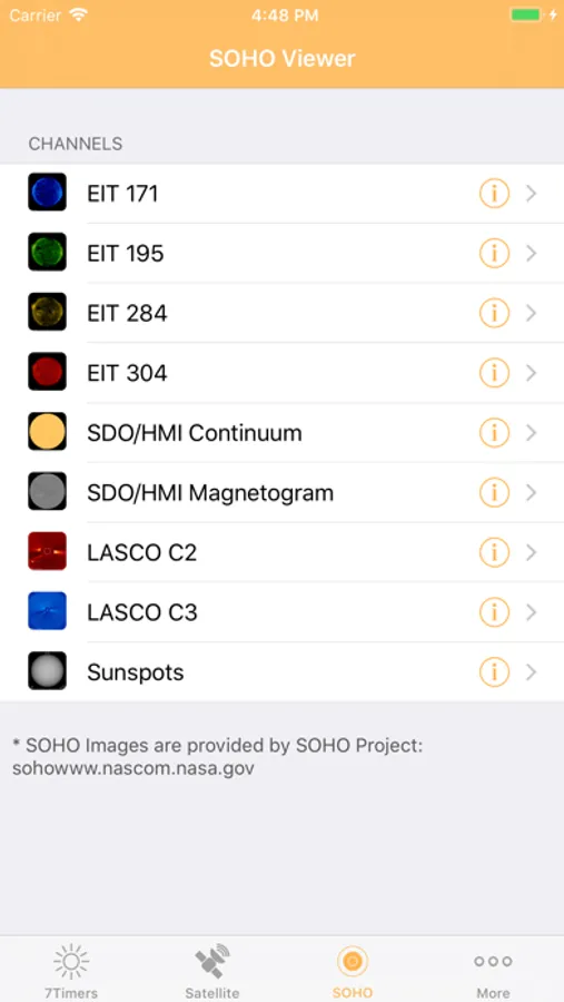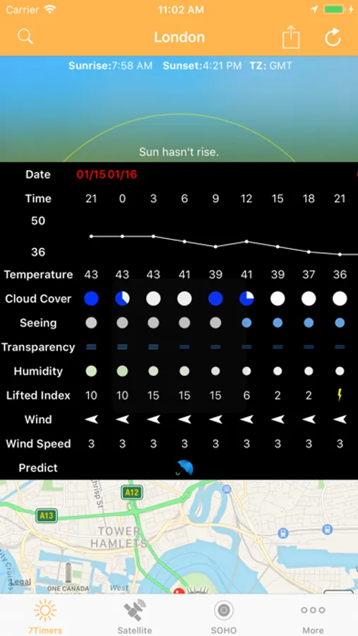 7Timer! is an important part of the app. It provides weather information that is related to astronomy. The forecast range is 3 days and include informations about cloud cover, astronomical seeing and atmospheric transparency, etc.
