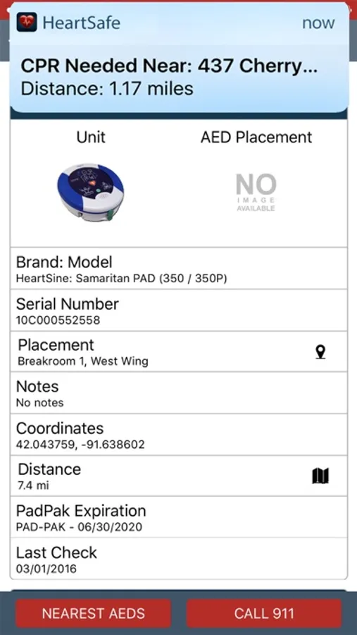 Private AED owners and organizations with AEDs on site can register (“Place It”) any devices they own as well and improve the local 911 dispatch knowledge on where the closest AEDs are located at an organization or public area where the 911 caller reports a cardiac CPR-related emergency. 911 dispatch centers can also alert any HeartSafe app users nearby (profile settings allow app user to set desired perimeter for alerts from 0-100 miles away) of a CPR emergency and where the nearest AED is located, allowing one-touch directions, improving AED response times, and enabling early CPR.