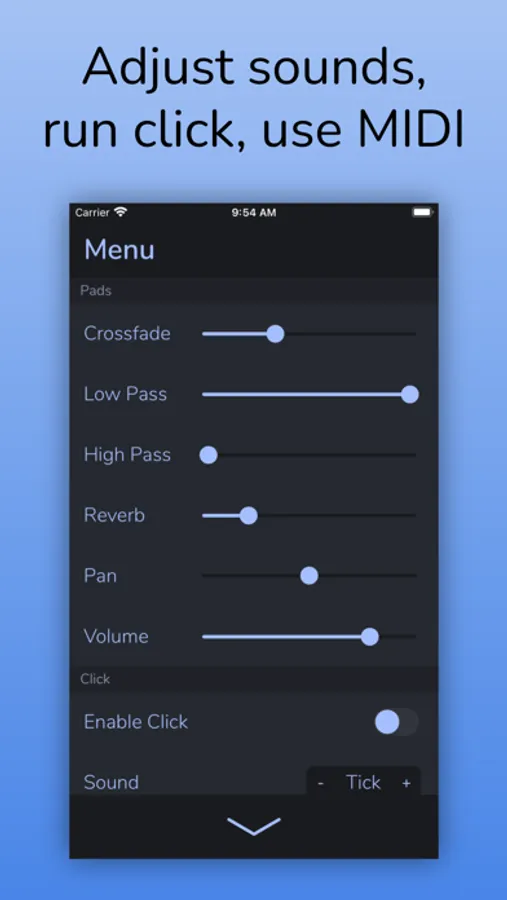 - Shape your sound. AutoPad's menu gives you control over crossfade time, high-pass and low-pass filters, reverb amount, pan, and volume.