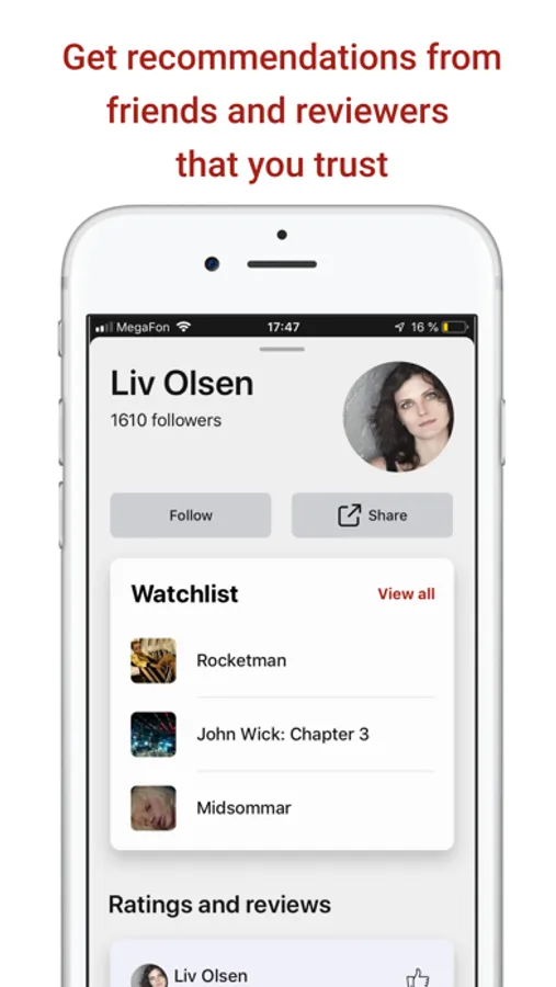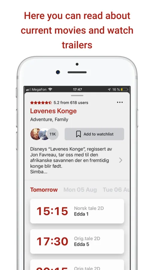 • Add movies you're looking forward to the "watch list" and get a reminder when they come to the cinema.