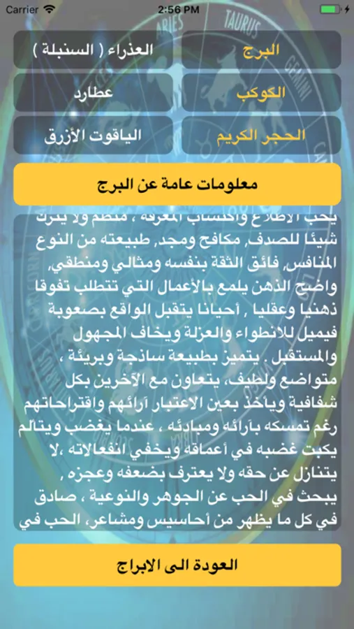 برنامج الابراج برو يتيح لك خاصية معرفة صفات البرج ومميزاته وذلك بحساب اسم الشخص و اسم امه بما يسمى بالجمع الكبير و الذي يكون ترتيب احرفه بنظام ابجد هوز و هذه الأبراج قديمة الأزل كما يقال منها تعرف مواصفات الشخص الجسدية و الروحية و قد درس العرب قديما هذا العلم وهذا يعرف من اسمه و اسم والدته تنقسم هذه الأبراج الى 12 برج مثلها مثل الأبراج الغربية الأسماء و الترتيب ما عدى برج العذراء في الأبراج العربية يسمى السنبلة و كل برج مصنف الى ابراج خاصة بالمرأة و ابراج خاصة بالرجل و كل برج سواء للمرأة او الرجل له ثلاثة اوجه يحكمها كوكب معين و منه تختلف صفات الشخص حسب الوجه الذي ينتمي له من البرج