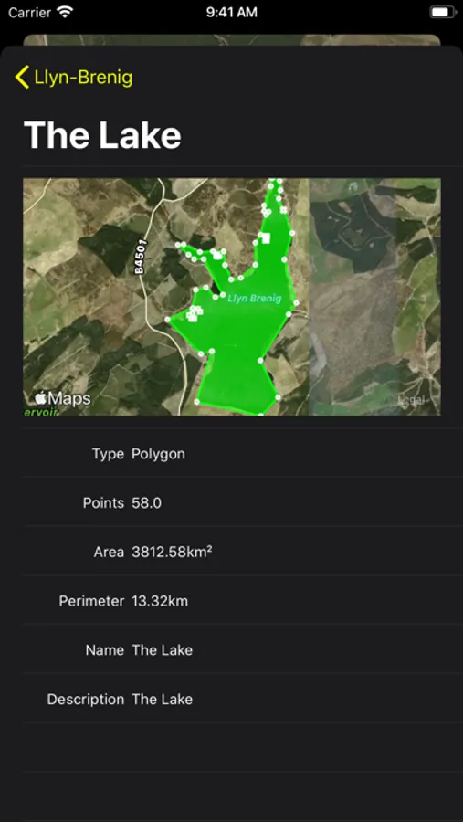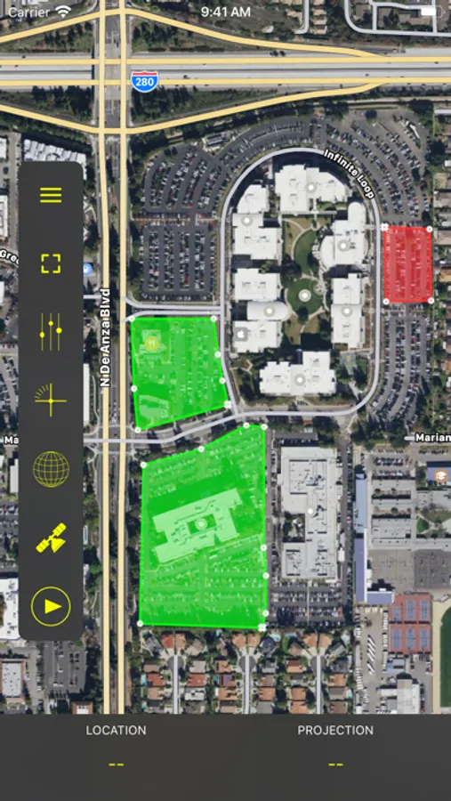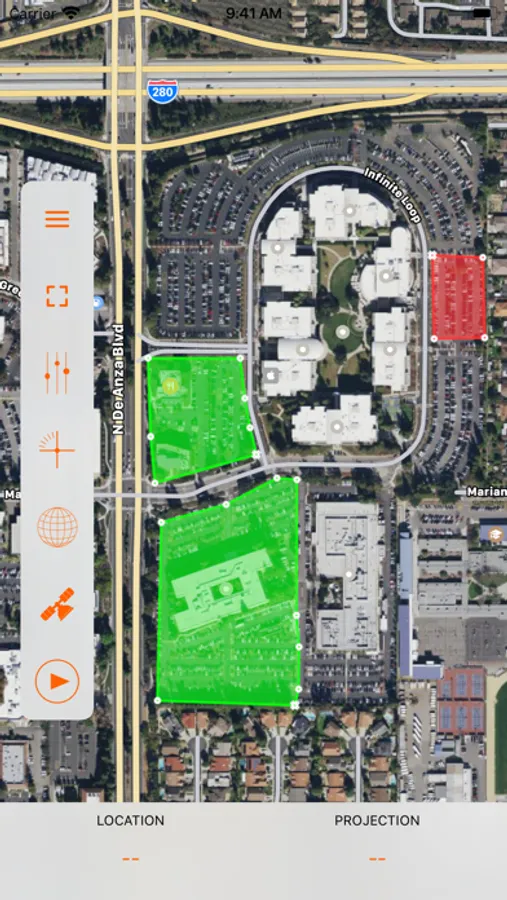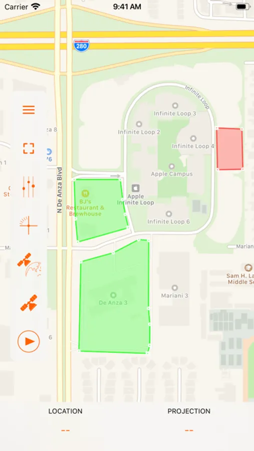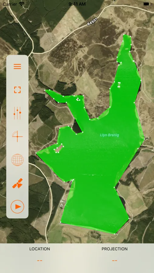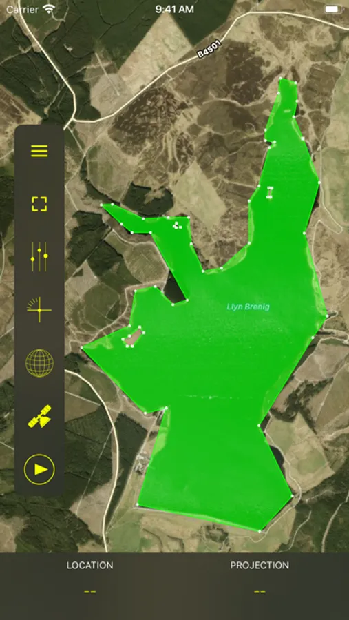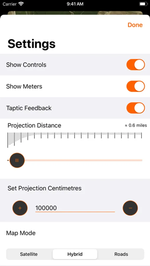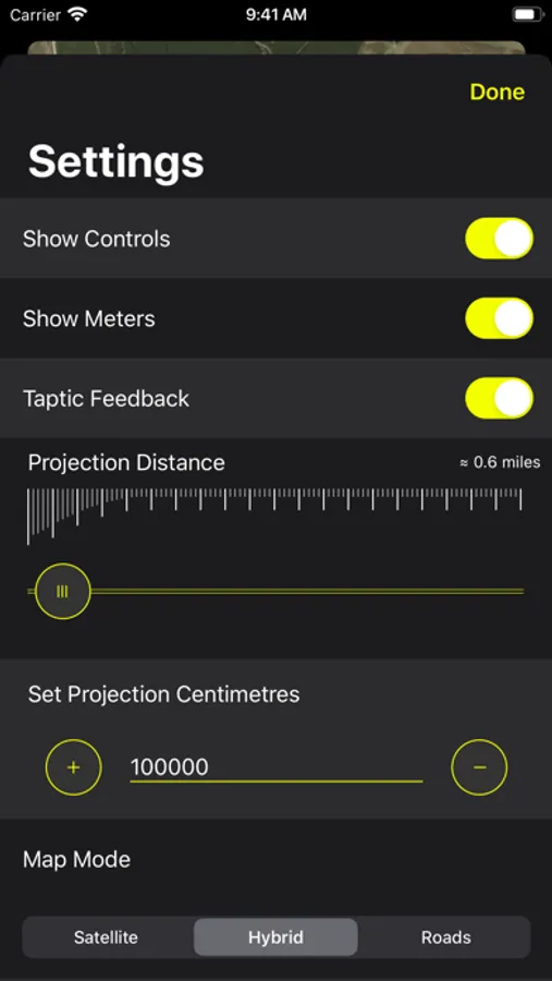 In the settings menu the distance to the projected point can be entered manually as centimetres. The projection distance can also be set in the full screen map view by tapping and holding, then moving your finger around, which manually sets the projection location and projection distance. The updated heading is displayed above. The newly set projection distance remains even when you hit play and use the viewfinder. The heading can be displayed in degrees, radians or NATO mils.