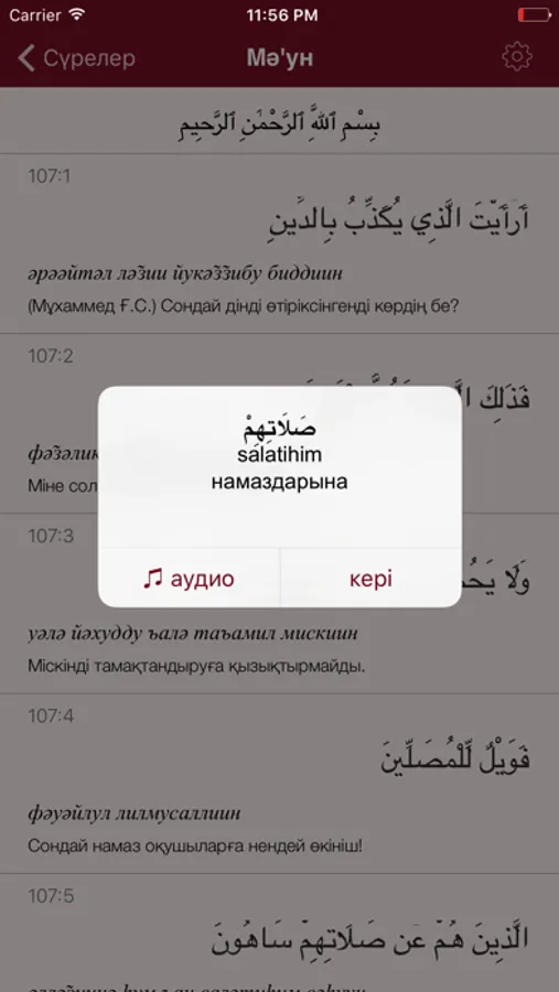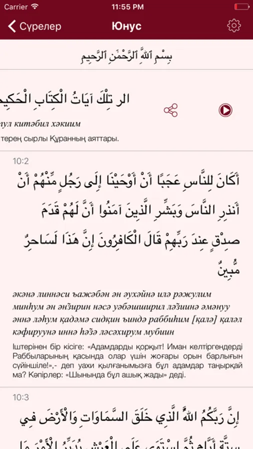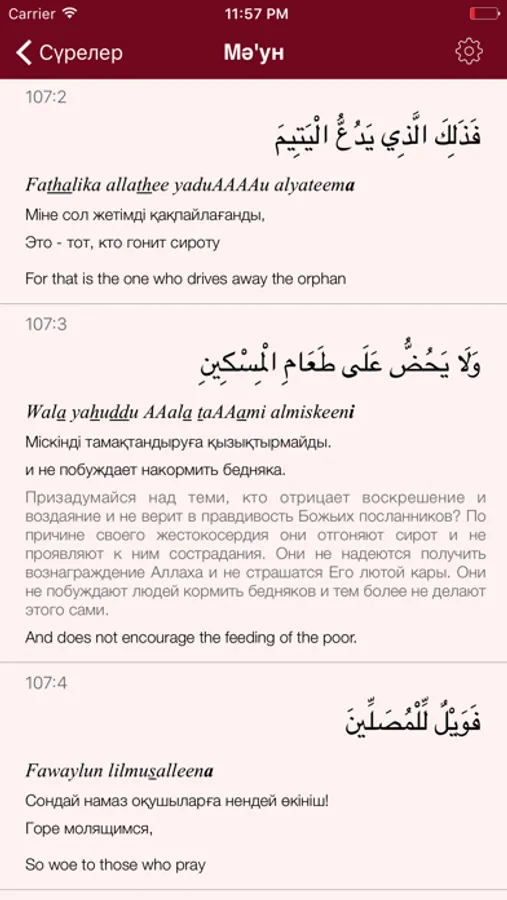 Құран қазақша, орысша және ағылшынша мағыналық және сөзбе сөз аудармалары. Әр аят пен әр сөздің аудиосы ұсынылған. Тәпсірі орыс тілінде.