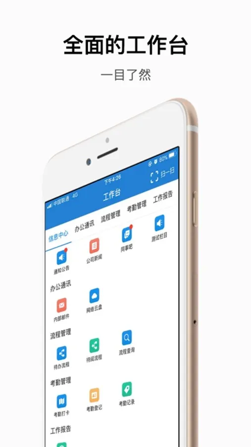 手机EAP涵盖了企业工作中各方面的功能:内部通信、内部邮件、流程审批、工作动态、考勤签到等功能,还有更多功能等待您亲自体验。