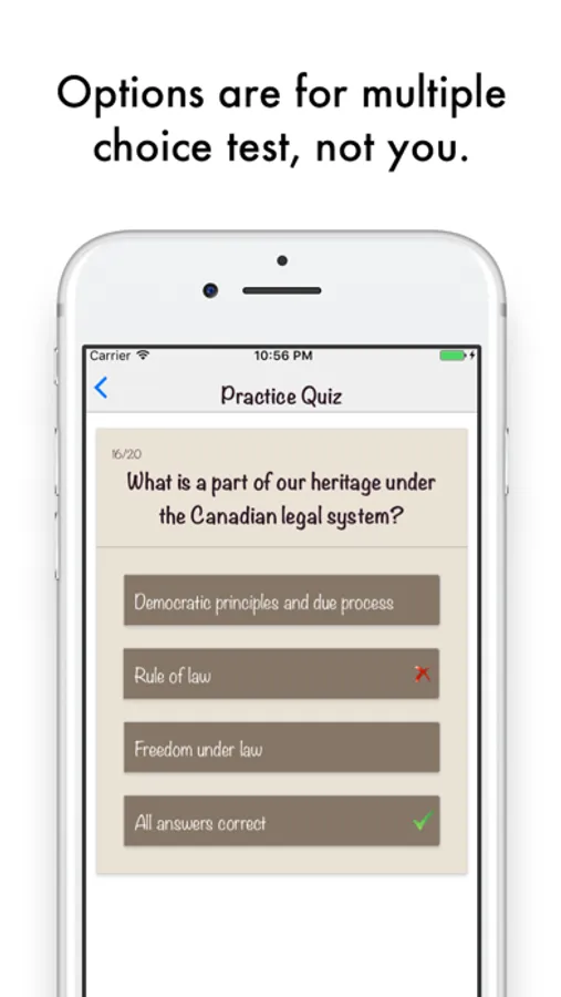 The practice test questions derived right from the book Discover Canada, on which the test is based. All questions and answers have been selected carefully and verified as close as the real test. The actual Citizenship Exam consists of twenty multiple choice questions. You can use this application to practice answering the same multiple choice questions that may appear on the real citizenship test, or simply understand more about Canada. Keep practice makes perfect!