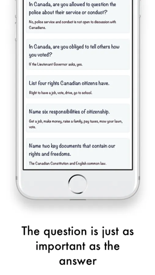 Failure rates for immigrants writing citizenship tests have soared when tougher questions and revamped rules made it harder for newcomers to become Canadian. This application is used to study and prepare you for the Canadian Citizenship Test. Intended to be plain simple and easy to learn; By using the app, you not only study fast, but also finish the real test as quick as possible. Records show that most people using the app only need 5 minutes to complete the real test.
