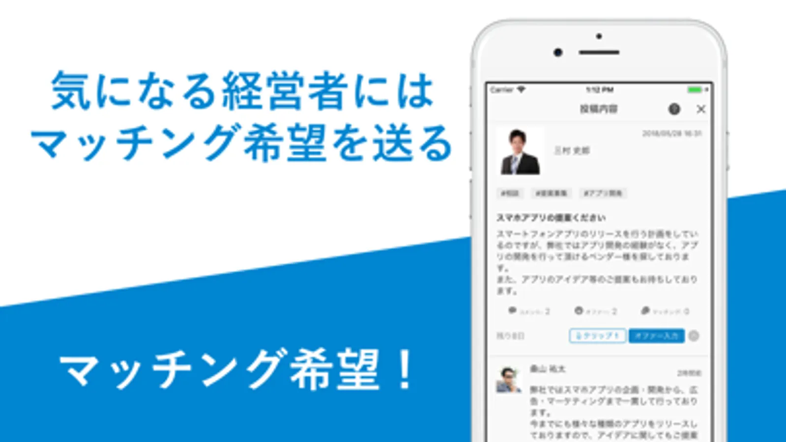 〇投稿した経営者にマッチング希望や、コメントを投稿した経営者にもマッチング希望を送ることができます。