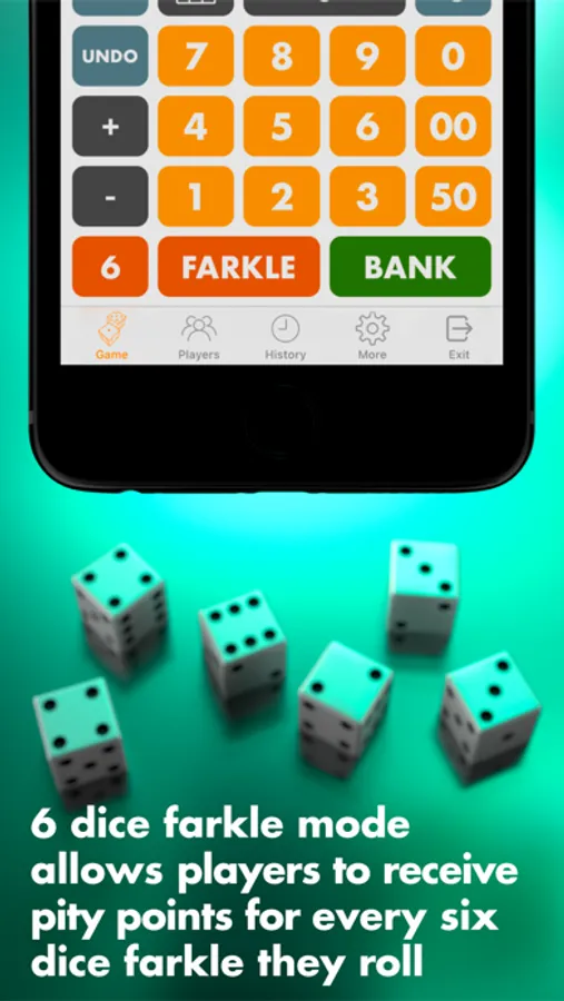 • "3 consecutive farkles" mode - you control the amount of points to deduct from players who roll three farkles in a row. Watch as the heat turns up each time the farkle hits.