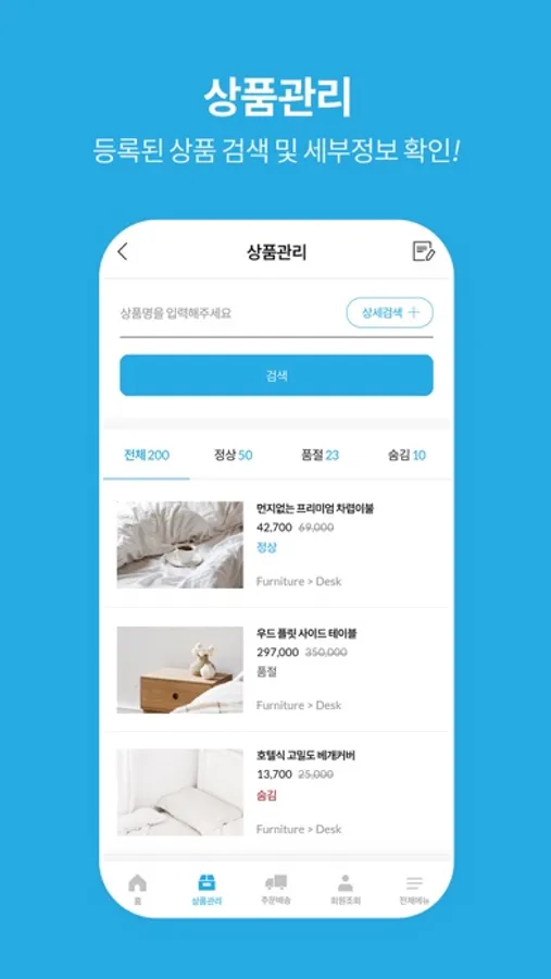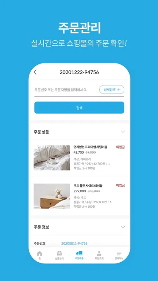 등록된 상품, 실시간 주문, 쇼핑몰에 가입한 회원을 검색하고 세부 정보를 확인할 수 있습니다.