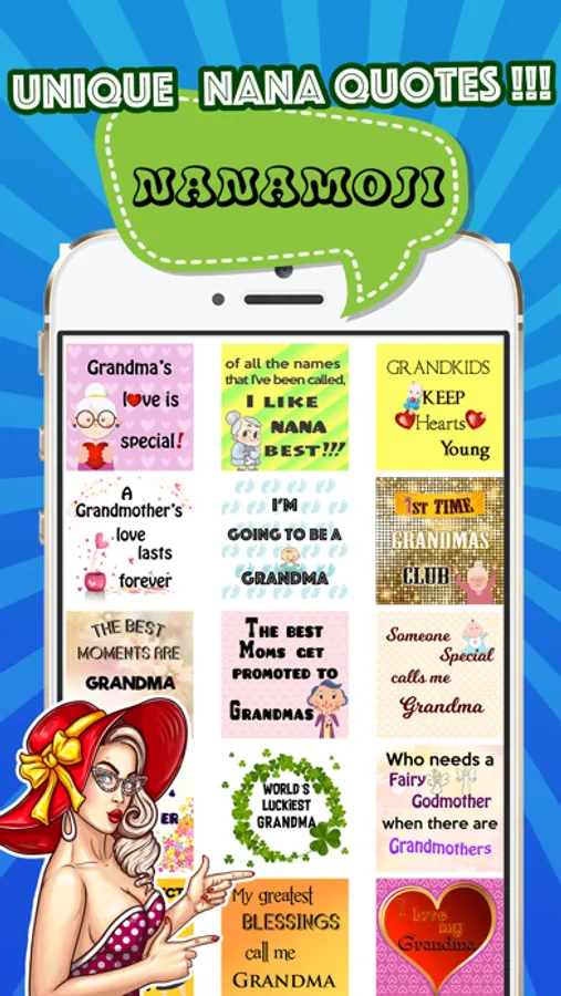 Get your best grandma or nana emojis and stickers in this Nanamoji. Dozens of cool and best grandma quotes and phrases available with this sticker pack app.