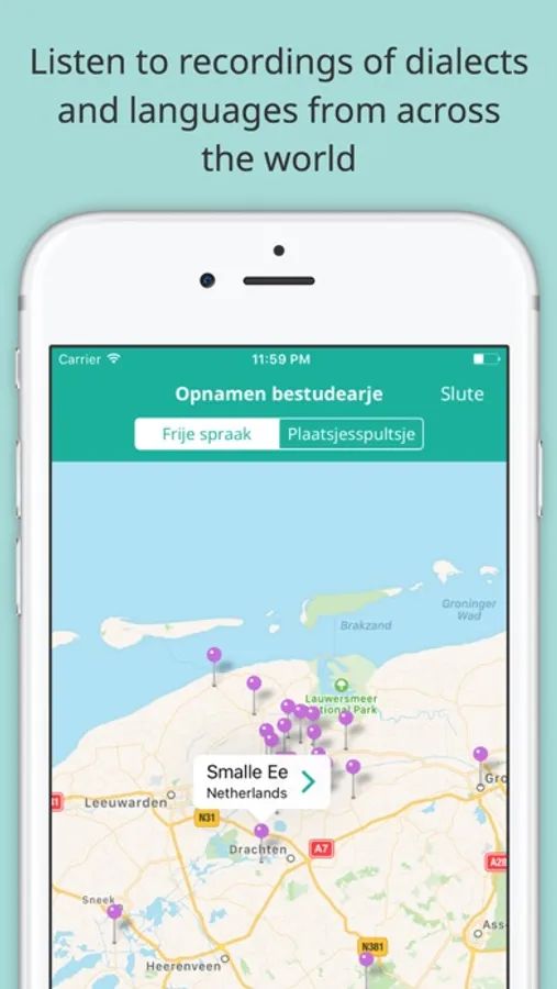 The Stimmen app is made by the University of Groningen with funding from Lân fan taal, as part of Leeuwarden 2018 (European Capital of Culture)