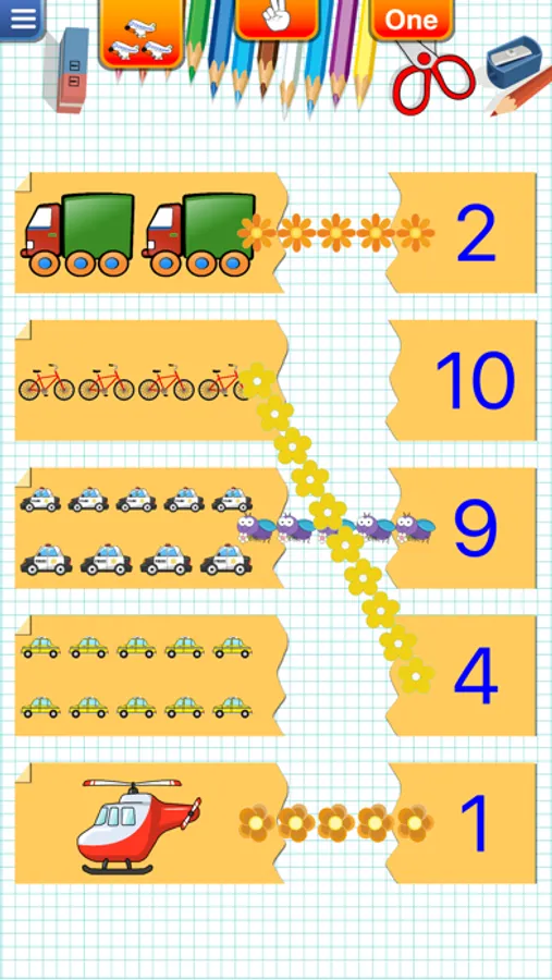 • QUANTITY: Match quantity to correct number with animation funny. Your child will count item(vehicle,animal,fruit...),finger,...