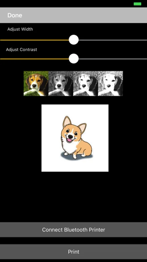 To print an image/photo, simply open it in any app that you usually use to view it (e.g. Photos) and then share it with the PhonePrint activity. Then you'll see it appear in the print preview window. You can use the slider to adjust the contrast of images to get the best possible result when the image is printed in black and white.