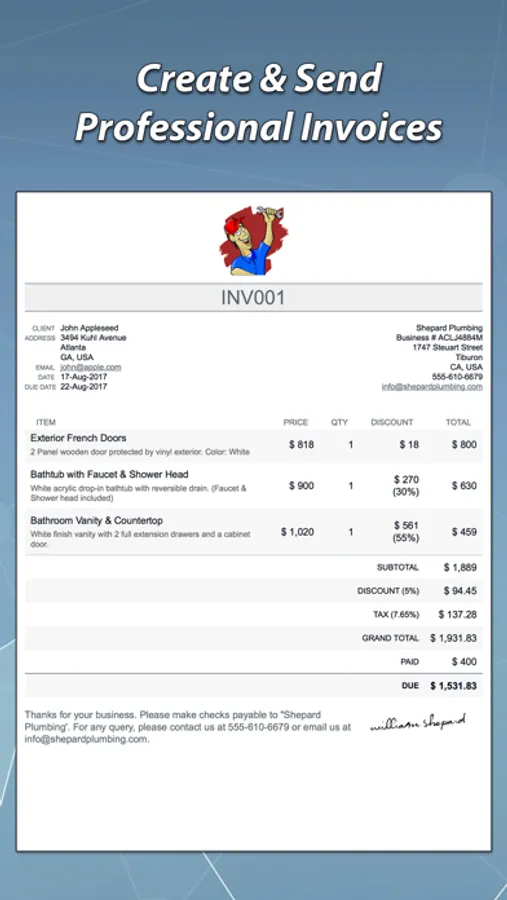The app also keeps track of all the payments made towards an invoice. You can also sign the invoice or estimate on your device.