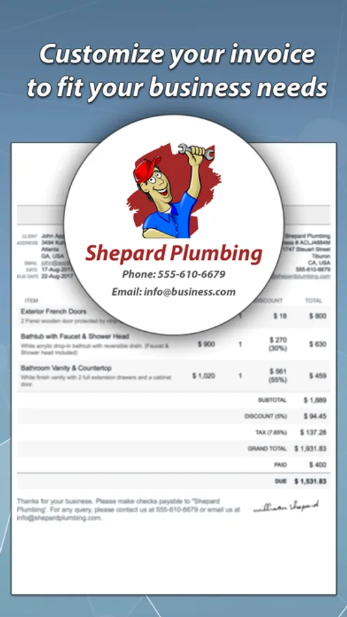 You'll be able to create invoices and estimates with-in few seconds. This business app allows you to create unlimited customers, products and services. You can choose from highly professional templates to generate invoice PDF and send it to your customer. You can enter all information about your business i.e. your company name, logo, address, email, phone number and more.