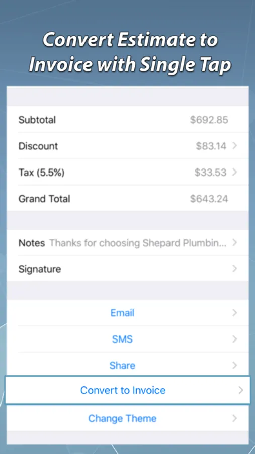 * Convert estimate to invoice with just a single tap.