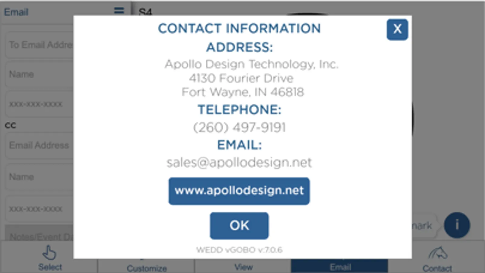 Check with your venue representative or DJ to determine the gobo size needed for the lights available. Email the final gobo directly from the app to an Apollo Dealer.