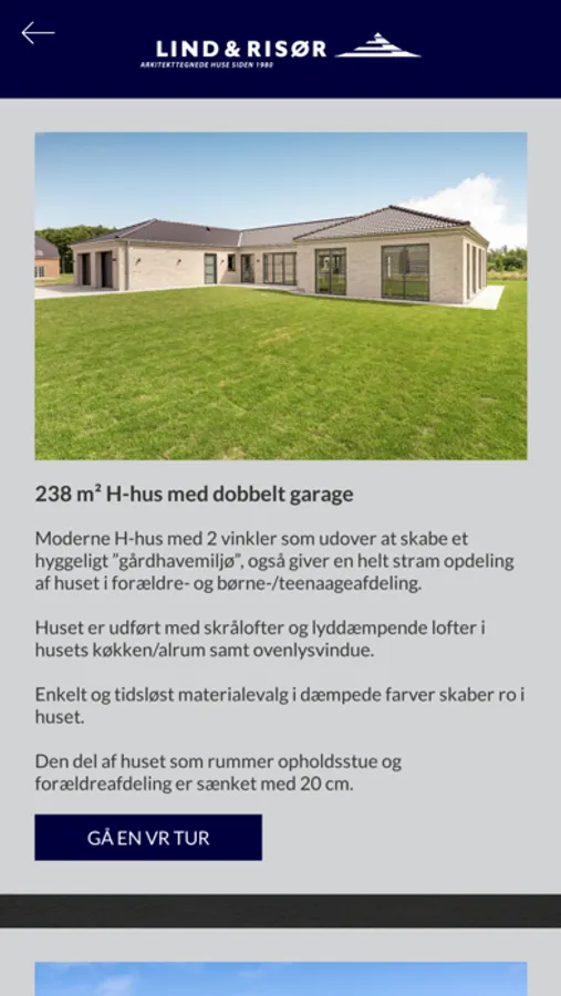 Lind & Risør app'en giver dig chancen for at opleve dit nye arkitekttegnede hus - inden det er bygget. Som en del af det at bygge med Lind & Risør, får du muligheden for at opleve hvordan dit unikke hus føles at gå rundt i via virtual reality. Gå en tur i dit hus og fornem om det giver den helt rigtige fornemmelse i maven. Du kan både bruge mobil, tablet og VR-briller.