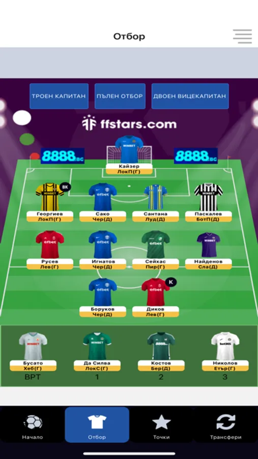 - Отбор от 15 футболисти, в схема избрана от теб