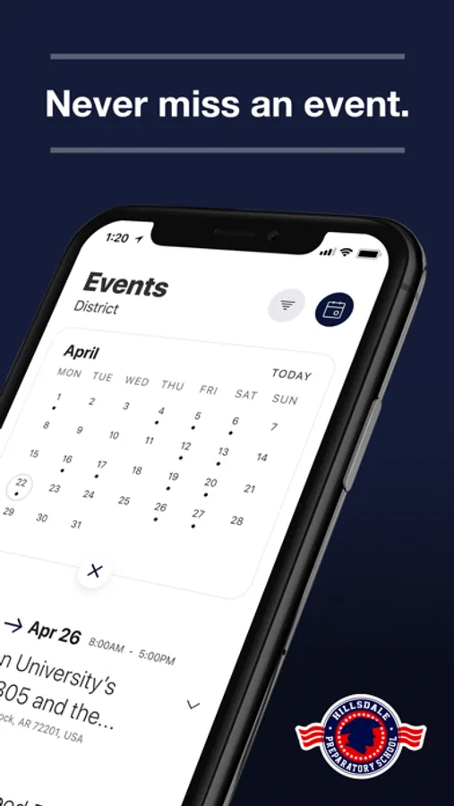 The event section shows a list of events throughout the district. Users can add an event to their calendar to share the event with friends and family with one tap.