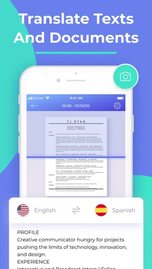 • Scan text or documents and translate from and into more than 50 languages, including English, Spanish, Chinese, Arabic, Portuguese, German, Japanese, French, and Russian
