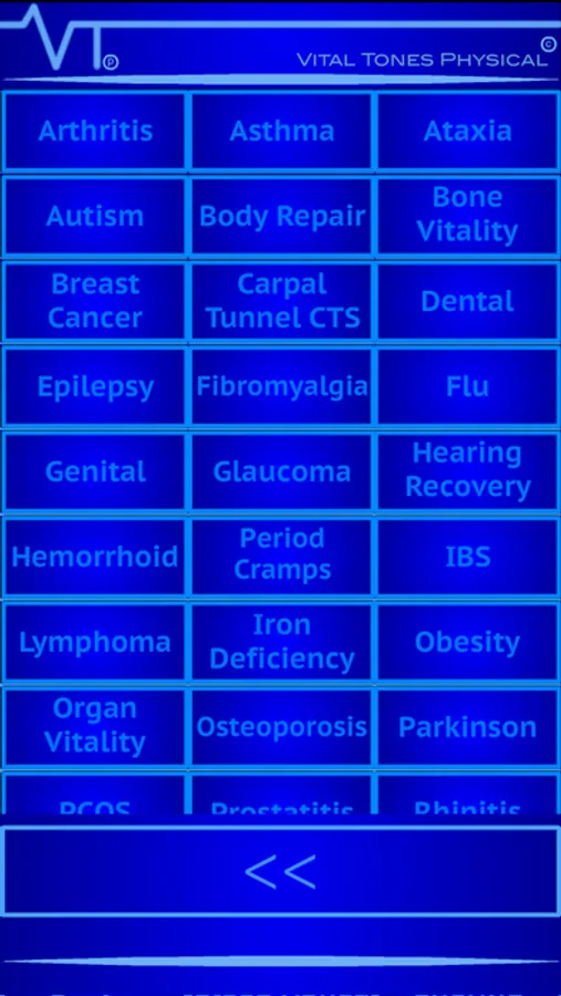 Our app offers a comprehensive range of therapies, each carefully tailored to address specific conditions and enhance overall well-being. By leveraging the latest scientific reports available, Vital Tones provides targeted therapies for arthritis, asthma, ataxia, autism, body repair, bone vitality, breast cancer, carpal tunnel syndrome (CTS), chronic obstructive pulmonary disease (COPD), dental health, epilepsy, fibromyalgia, flu, gastroesophageal reflux disease (GERD), genital health, glaucoma, hearing recovery, hemorrhoids, iron deficiency, irritable bowel syndrome (IBS), lymphoma, obesity, organ vitality, osteoporosis, Parkinson's disease, period cramps, polycystic ovary syndrome (PCOS), prostatitis, restless legs syndrome (RLS), rhinitis, sleep apnea, snoring, sexual arousal, sexual desire, stimulation for arms, legs, and torso, strabismus, tremor, vision, and weight loss.